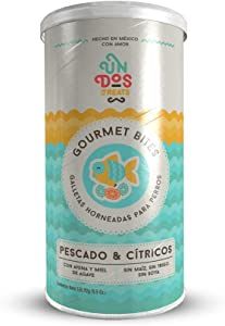 Galletas Gourmet de pescado y cítricos con avena y miel de agave, sin maiz, trigo y libre de soya. Ideal para todas las razas, etapas y edades por ser faciment masticable.